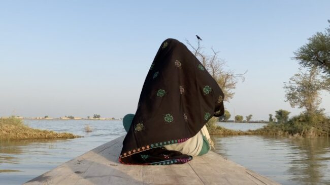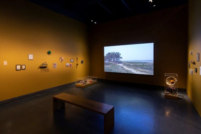 Pakistani artist Zahra Malkani’s “A Ubiquitous Wetness” immerses audiences in the spiritual and political significance of the Indus River. Malkani’s medium includes film and interactive displays, where audiences can engage with her audio archive. The work was recorded following the devastating floods in Sindh in 2022.