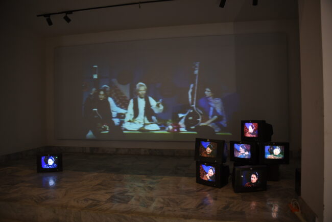 Humans are made of many ingredients, mainly of past and present. Risham Syed in her multi-screen video installation (at Barkat Ali Islamia Hall) combines footage from her personal history. Syed has displayed the recording of her late mother singing with her Ustad. The installation invokes memories – of a bygone past, of a person not there anymore, yet still alive within other human beings.
