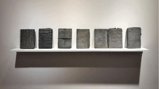 Irfan’s sculptural books, at first glance, resemble sacred relics, echoing the form of ancient Bibles or religious codices. Their upright, sealed bodies invite a curiosity as to what is within, obstructed from touch, appealing to view. One book pierced by nails subtly referencing the crucified Christ or perhaps the African fetish totems, the power figure – the Nkisi Nkondi. Yet, these objects do not reveal, they resist. Made with papier-mâché and ash-toned textures, the books appear fossilized like stone, unreadable, and incised with rusted, cuneiform-like marks. By sealing them shut, Irfan transforms the book from a source of knowledge into a monument of loss, reflecting on forgotten histories, erased languages, and the limits of access.
