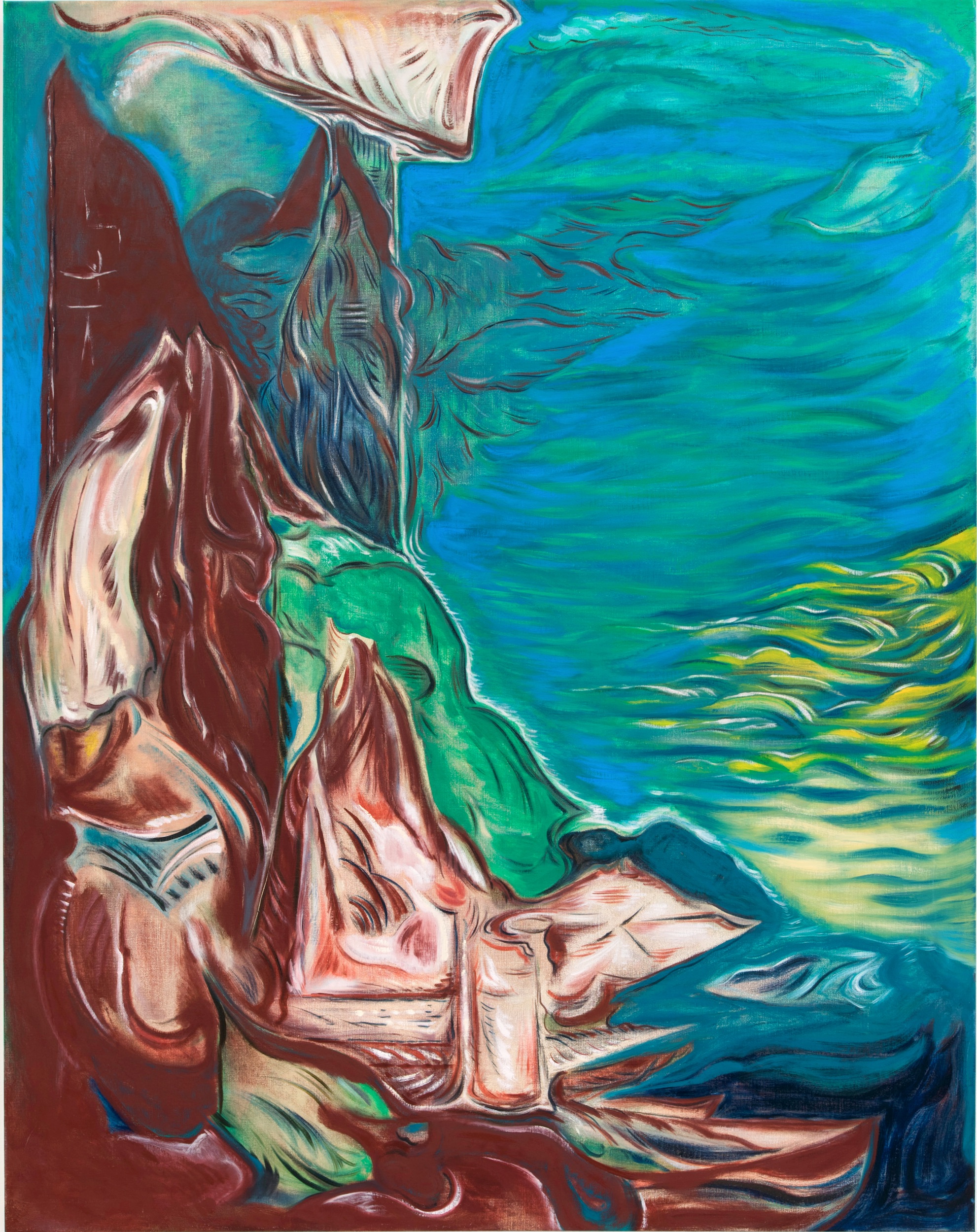 In After Here, the viewer is engaged and transported into a scorching valley which is engulfed by terracotta and a resurrection of reds and pinks. The lush space is concurrently landscape and fire. This painting is noticeable by the ease with which it liberally defines a space concerning the intricacy of presence and the refinement of being. Detained in deferral amid these spaces, Fahlstrom beseeches his viewers to dwell in the rhythmical yet spirited surface.