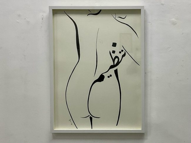 Misha Japanwala’s star rose exponentially for her heroically brazen and unabashed, detailed casts and body plates of breasts. Unsurprisingly, the artist received vehement criticism from all corners of the world, and walks of life, on her choice to de-radicalise heavily policed sites of discord – female and trans-gendered bodies. Japanwala’s relationship to shame rapidly evolved past the point of its lexical anatomy, to a Psychonaut’s journey to the Omphalos of desire, commodification, victimhood, control and above all, perception. In her two-dimensional works from ‘Nyx’, such as ‘Jaahil’ (Ink on Paper, 14 x 11 Inches, 2023), a grace and lyricism of line-quality in a monochromatic palette render words through the anatomy of female flesh. The calligraphic curves accentuate and simultaneously form the breasts of this headless figure. Her three-dimensional series, collectively titled ‘Beghairat Congregation’, asymmetrically arranged groupings of resin and metal coated, disembodied breasts, are simultaneously fragile and imposing. Each ‘breast’ imitates the natural textured puckering of an animated being, testament to the artist’s honed skill in the arduous process of casting the delicacy of skin. Much like the breasts of Michelangelo’s virago Sibyls in the Sistine Chapel, upon which the Master sculptor and draughtsman projected androgyny, Japanwala divorces the sexuality from the body part, creating the opportunity for a purely aesthetic dialogue with the viewer. In most art, monumentality or abstraction impersonalises and therefore, it may be argued, masculinises women, which was certainly the case in the Western Canon’s Mannerist movement. The impersonalisation in Japanwala’s breasts however, leans towards stripping bare all semblance of vulnerability – any allusion to sin, guilt, or lust obliterated.