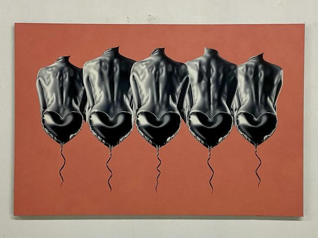 Scheherezade Junejo, on the other hand, takes a much bolder approach to addressing the desire to lay claim to others. Perhaps her most arresting piece out of this collection is ‘Eye Candy’ (Oil on Canvas, 48 x 36 Inches, 2023), a collage of arresting kitsch, pop and Humanist realism which leaves nothing to the imagination. The ripple and torsion of muscle and bone is visible in the bare torso while all vestiges of identity vanish through the grotesque-noir of an animal skull in place of personification.