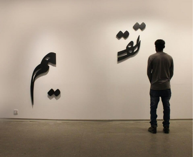 While calligraphy art has brought international recognition to Pakistani art industry, in contemporary practice, the medium of “text” is being used by conceptual artists while traditional or Islamic calligraphy is on the periphery. The conceptual Pakistani artist prefers to theoretically link their practice to the western text-based art from 1970s and beyond, that transforms text into visual expression. This transformation is evident not in just calligraphy but across all genres of art; from fine art to film and TV. The artist seeks to express social and political motives through their practice and the fragmentation and re-arrangement of script has emerged as an artistic technique.
