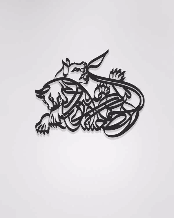 Artist Muzummil Ruheel, who was trained in calligraphy before joining art school, uses language to critique social realities. In Misunderstanding (2019), his usage of letters is performative and literal, where the word Urdu word “taqseem” meaning “to divide” is itself divided and with its middle part missing, however, carries layers of meaning related to unity amongst community and the partition of the nation. In his 2025 solo show at Canvas gallery, “The Wild in Our Mouths”, the artist used common sarcastic phrases uttered in Urdu language and illustrated them as animals. Here text was fragmented and used as sculptural forms. His use of animals hints at another religious calligraphic system different from Quranic verses: the illustrated Islamic medieval manuscripts and bestiaries, reminding us of the pre-modern visual language that we may have forgotten to link to calligraphy.