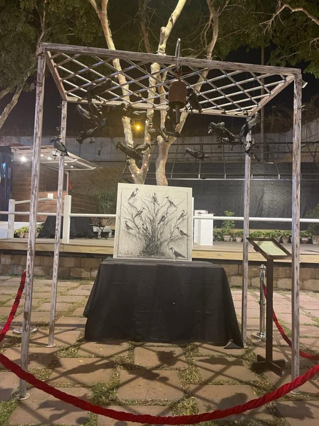 A S Rind’s signature black crows, strategically placed at a corner of the entrance, cast an eerie and intriguing aura. Rind’s artistic vision manifested in both sketch and sculpture, with the black crows not only rendered on canvas but also sculpted and suspended in mid-air. This eerie installation invited attendees to confront the mystique of the black crows, their stark presence creating a visual spectacle that played on the boundaries between reality and the macabre. The haunting elegance of Rind’s creation stood as a unique and thought-provoking welcome to all who dared to enter the artistic realm of the festival.