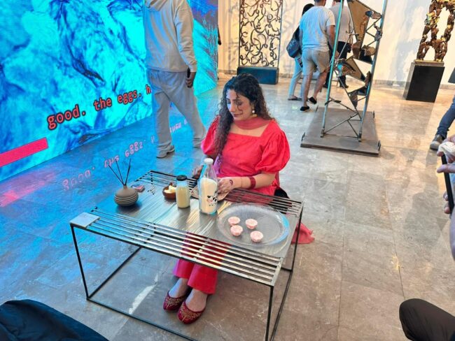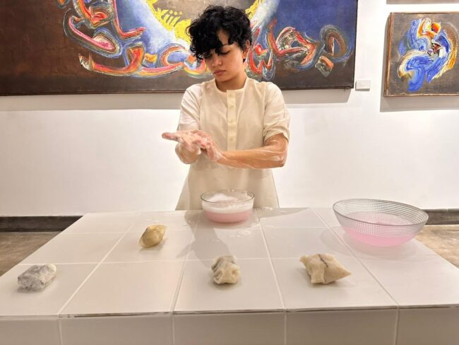 Umaina Khan made butter candies as an act of remembrance, invoking her grandmother through inherited knowledge and repetition. The act of creating for the audience transforms a private, domestic ritual into a public offering. It blurs the boundary between art and caregiving, between performance and hospitality. By sharing something edible, Khan invites viewers into intimacy, into taste, smell and sensory memory, allowing remembrance to be experienced rather than observed.