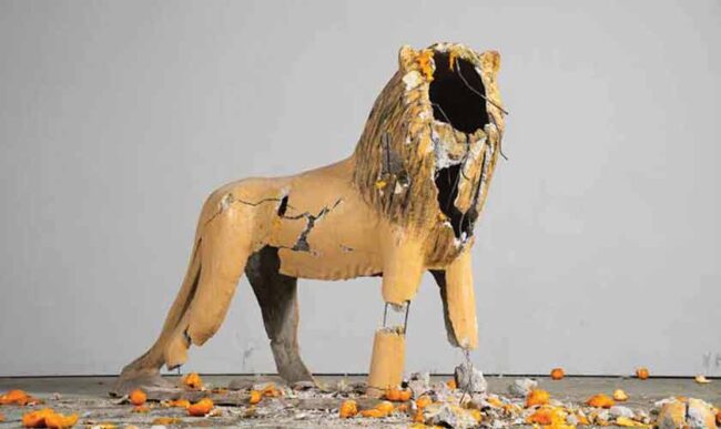 The fractured lion in Power Lion (2025) stands amid scattered oranges, its hollow chest and broken legs exposing the fragility of symbols. Once an emblem of sovereignty, it is now ruinous—what Fredric Jameson might call the allegorical ruin, where fragments speak louder than wholeness. The oranges complicate the allegory: vitality scattered around collapse, sweetness spilled beside decay.