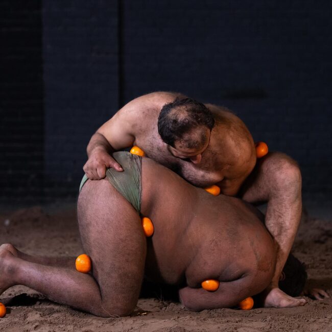 The diptych Anatomy of the Two I & II (2025) shows wrestlers locked in combat, their flesh punctuated by scattered oranges. Wrestling here is intimate rather than antagonistic; bodies entwine as much as they resist. The fruit transforms the scene into theatre, comedy, and tenderness at once. Mahmood stages the body as both site of contest and a site of care.