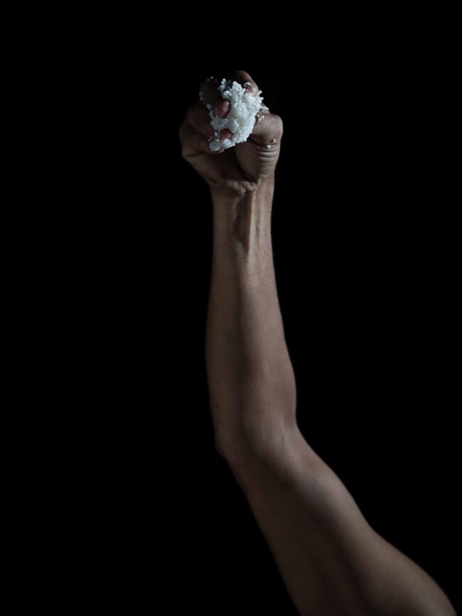 The photographic series A Complete Meal (2025), nineteen variations of an arm outstretched with a clump of rice, epitomises Mahmood’s investment in delay. Each frame repeats a gesture both ordinary and monumental: the offering of food. As Henri Lefebvre reminds us, rhythm emerges wherever energy, place, and time intersect.¹ In Mahmood’s hands, rhythm becomes refusal—refusal to let sustenance be consumed in an instant, instead stretching the act into an archive of nourishment. The viewer lingers, and in that lingering, equality is glimpsed.