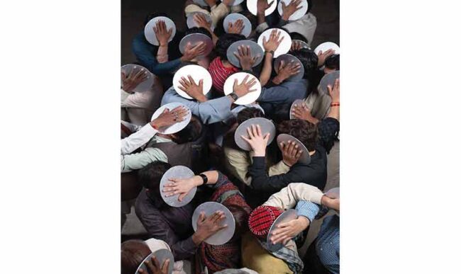 In Total Eclipse (2025), a crowd covers their faces with silver discs, pressing anonymity against their own skin. It is both absurd and terrifying—a lunar eclipse enacted through human erasure. Here, Mahmood stages conformity and concealment as a collective ritual, where individuality is occluded in favour of a strange synchrony. The eclipse, usually a cosmic alignment, becomes a metaphor for mass surveillance and social disappearance.