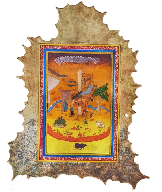 In Daisy Cutter, Walayat employs stretched sheep skin as her canvas, invoking an archaic sense of fragility and timelessness. The narrative unfolds amidst a surreal landscape, populated by animals, fragmented architecture, and symbols of destruction. The work speaks to the fragility of utopias and the haunting omnipresence of loss.