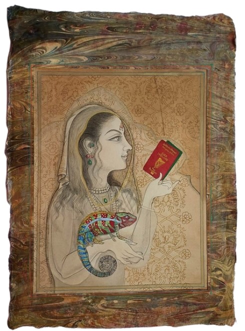 In one of her paintings; Untitled, Walayat depicts herself in profile, draped in a traditional South Asian dupatta, holding a red passport—likely symbolic of her journey. The passport in her hand can be interpreted as a symbol of both freedom and constraint. While it suggests movement and global citizenship, it also signifies the bureaucratic complexities and emotional sacrifices inherent in migration. The chameleon, on the other hand, is a powerful metaphor for assimilation and resilience, traits often demanded of those living in the diaspora.