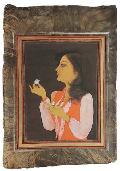 Amna Walayat’s self-portraits are deep visual narratives that personify the complexities of identity, belonging, and the emotional tensions of cultural duality. In her series of self-portraits, Walayat uses a thorough combination of traditional materials and techniques—including gouache, tea wash, pigments, lead pencils, marbling, and 22-carat gold on Wasli paper—to explore her lived experiences as an artist within the South Asian diaspora. These paintings are as much personal reflections as they are commentaries on the broader themes of diaspora and displacement.