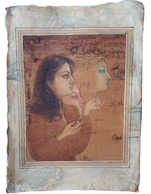Another painting, Conflict, plunges deeper into the psychological and emotional tensions of identity. Walayat portrays herself in a multi-layered composition, with overlapping profiles of different expressions. Each visage seems to represent a fragment of her internal dialogue, grappling with the competing expectations of tradition, modernity, self-expression, and societal norms. The text scattered across the background—words like “God,” “Save the Queen,” and script in Urdu—adds another layer of complexity, highlighting the competing cultural and linguistic influences in her life.