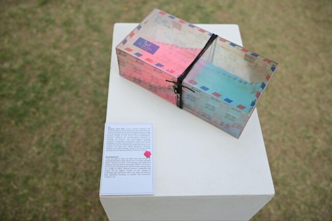 Works were displayed across various outdoor and improvised architectural sites. Installations were positioned in trees, wrapped around lamp posts, placed in shrubs, stretched across open lawns, and situated along pathways. Viewers experienced the exhibition by moving through the space, allowing for moments of pause and reflection. Attention was drawn through proximity, chance encounters, and shared presence.