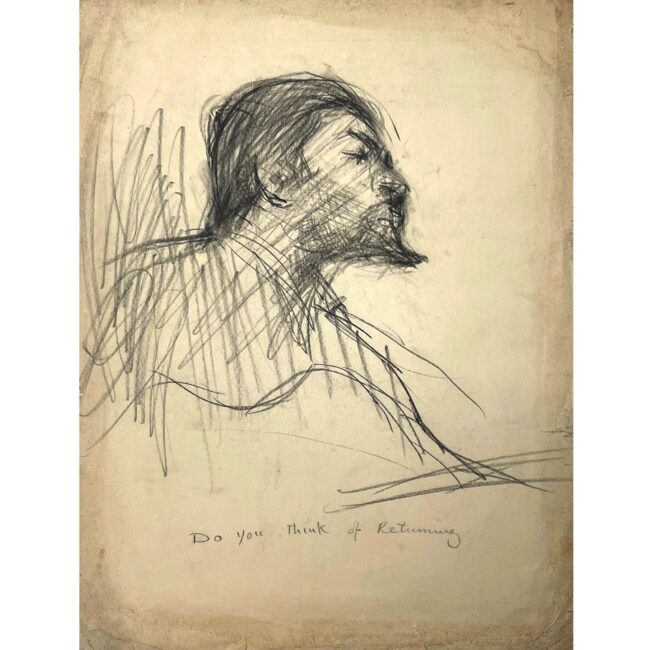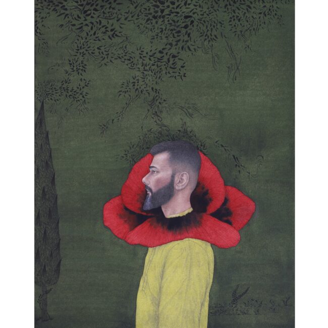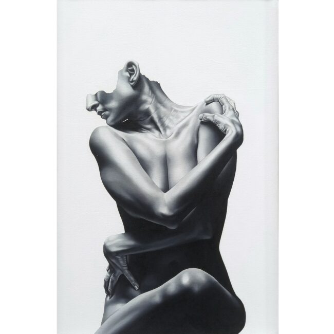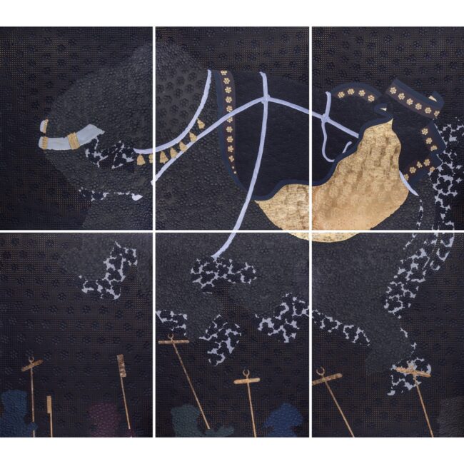 “Do you think of returning?” A piece of text in Colin David’s charcoal drawing caught my attention immediately. This probing, existential question moves the viewer beyond the worldly bounds of the body. In a similar evocation, Ahsan Memon’s “The Dreamers” highlights the realm of dreaming and its connection to our body. In his hexaptychs, Abid Aslam uses gravity as an anchor. “Falling” and “Soaring” indicate literally the physical acts that we observe in life, how the spirit feels in dreams as well as symbolize life’s setbacks and achievements; triumph and resilience. These works bring to focus the connection of humanly experience and presence on the earth and away.