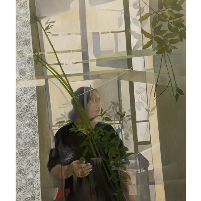 Scheherezade Junejo has painted a hyperrealistic, seminude woman’s body, with just enough covering and erasure to not lean into pornographic display. The artist generally works with this edge in her practice. In the clenched poses, where the arms and waist of the body are activated, I see restrictions and expansiveness as points of reference. Meanwhile, Madiha Hyder draws hyper-realistically with charcoal and graphite and shows assertiveness and authority in body posture. In a world increasingly governed by biometric surveillance, through Scheherazade and Madiha’s works, DNA extends beyond biology into questions of power, consent, and control.