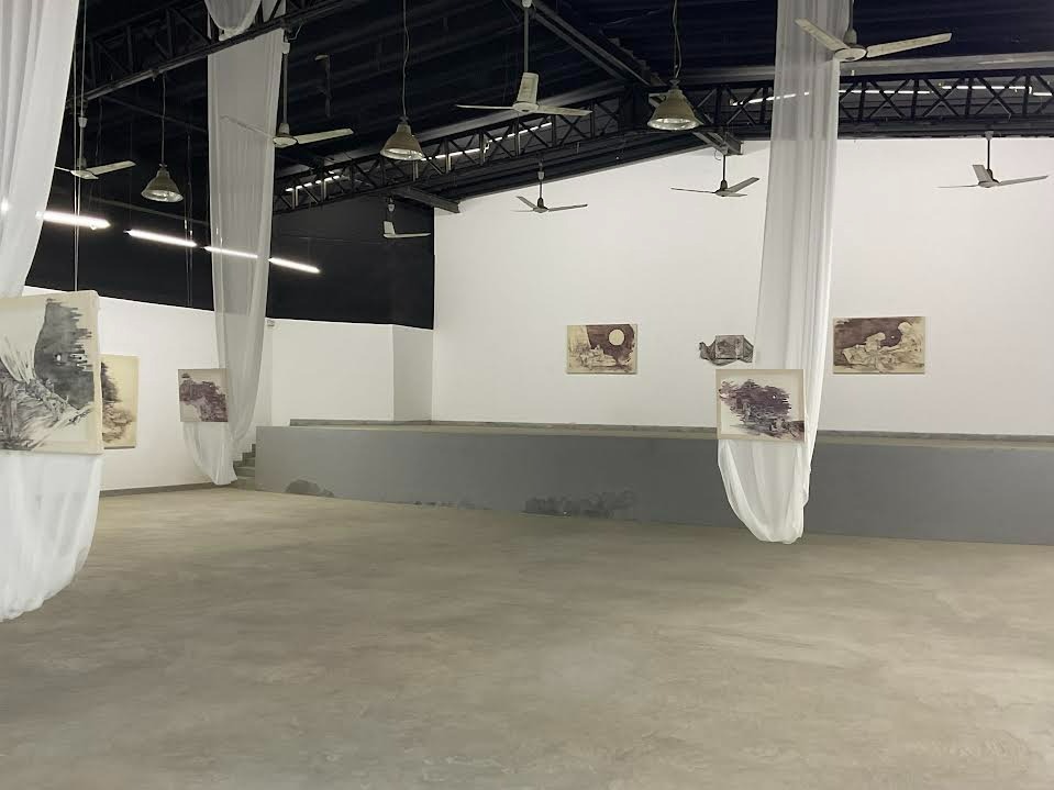 Noor Ahmed’s curatorial framework foregrounds intimacy. The decision to hang some works away from fixed walls allows viewers to encounter the reverse of the canvases, the visibility of the back of the canvases subtly destabilizes the autonomy of the image. What is typically concealed becomes part of the viewing experience. This gesture resonates conceptually with Mansoor’s thematic concerns, just as her figures oscillate between revelation and obscurity, the works themselves hover between visibility and vulnerability. The draped fabric, suggestive of veiling, further complicates the politics of concealment and disclosure. It produces a spatial rhythm of partial visibility, echoing the exhibition’s dreamlike logic in which clarity is always deferred and forms appear in states of emergence.