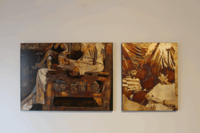 Meanwhile, Swarim Abid Hasan introduced an entirely different material and temporal register. His canvases, built from layers of oxidized silver leaf and oil paint, embraced tarnish as a painterly collaborator. In works such as Under the Fabric and Seated in Oak, figures and forms emerged from the unpredictable chemical processes of oxidation. Here, decay was not destruction but transformation, a slow unfolding that allowed new surfaces and narratives to emerge. Hasan’s juxtaposition of geometric precision with organic patina-like effects reflected a tension between order and entropy, permanence and impermanence. The unpredictability of the process echoed human experience itself; we are altered, marked, and remade by the passage of time.