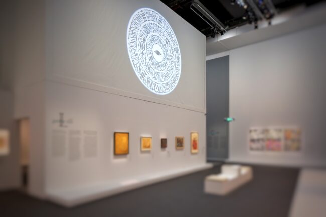 Dr Souraya Noujain, Curatorial and Collections Management Director at Louvre Abu Dhabi, discusses the cross-cultural influences of the showcased artists, such as in a painting by Paul Klee, who was influenced by his travels to Tunisia, creating work influenced by Egyptian hieroglyphics. His work influenced artists such as Josquin Torres-Garcia from Spain, Iraqi artist Dia Al-Azzawi, and Pakistani artist Anwar Jalal Shemza. Works by Adolph Gotleib were inspired by Native American art, and French artist Andre Mason, who was inspired by 17th-century Indian Figurative inscriptions and Arabic calligraphy.’ She further writes about Joan Miro, who referenced how closely painting and poetry were linked in the East. Following in his footsteps, the poets Brion Gysin, Henri Michaux, etc, pursued the same path by painting poetry, inspired by their trips to North Africa and China, Henri Matisse’s studies for the illustrated book Jazz, which he called “arabesques” in a tribute to Arabic writing. Dr Noujain also mentions the regional artists Shakir Hassan Al Said and Sliman Mansour, who sought to free calligraphy from its purely linguistic function. She refers to “two monumental works”, by El Seed and Sanki King.