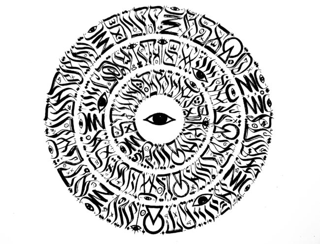 Inside this larger parameter of unlimited space was the equally powerful centre around which the symbols within “calligraphic “ circulated with balance, layering, and transformation from thought to language and meaning. The meaning, of course, alluded to abstraction and metaphysics. To quote him, there was an order in the text and in the order that it was created. Starting from the outermost ring and moving towards the centre, and sometimes, the other way around, the eye in the middle was painted at the end. The circular movement of form, the Mandala, has been a constant. He started painting Mandalas in 2016, which were first exhibited publicly at his first solo. The eye in the centre came in 2019. To decipher his imagery which initially pulls you towards its curvilinear script, there is an immediate desire to read, and because the script carries elements of Arabic calligraphy, there is a recognition of something familiar, the possibility of it being from a manuscript. Unreadable to the viewer, but not to the artist; that is a fascinating proposition. “The text and the order of the text don’t change, but symbols replacing text happen frequently. My symbols are actually an invented script which I created to replace the usual common writing systems and give different sounds and emotions my own symbols would represent them”, he says.
