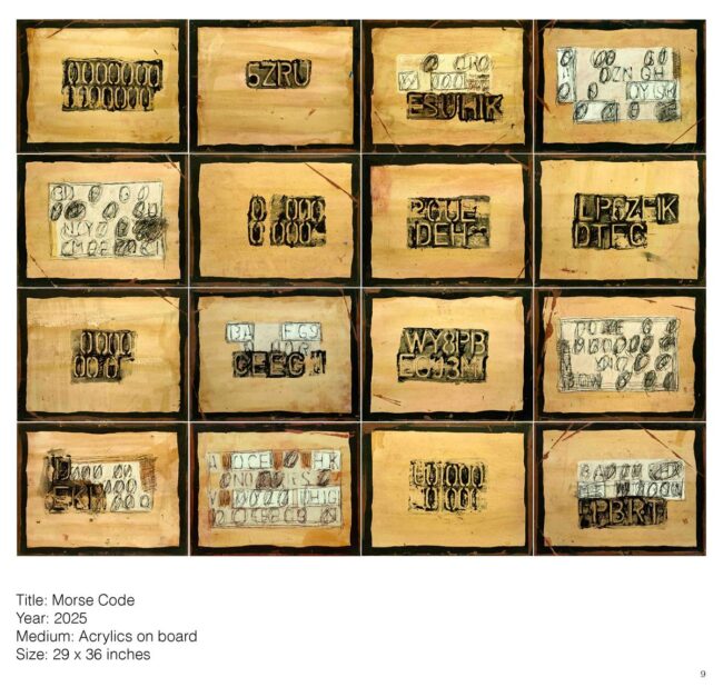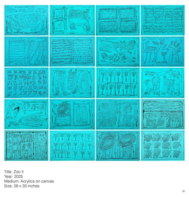 These debates are rooted in either the culture of commodity or class systems. Amidst this dynamic, Jalil’s practice positions itself as a contradiction to formal training, as highlighted in her artist statement that the work “critiques academically trained aesthetics and formal art education to understand cultures of authenticity in a visual language system”.Though I don’t think formal training induces pretense in artists, maybe the demand to produce, showcase and sell work does. Or maybe believing that trained aesthetics are better than the work of primitive artists and craftsmen, who used the natural environment, play or daily lives as inspiration. Modernism and technology may have played a role in stripping us from the imaginative and innate knowledge system. We have given up our decoding systems to external mechanisms. It starts with something as simple as looking at the title of an artwork or reading the artist statement to understand work. And escalates as far as asking AI to decipher art and literature for us. Everytime we try too hard and too far to make sense, we outsource our imagination and speculative abilities. In doing so, we forgo our authenticity behind the production of art and fall into the commodity culture. Though many artists, especially those working in analog mediums of drawing and painting, seem to be functioning perfectly along these social and capitalist margins, this exhibition sees otherwise. It reminds us of the social roots of art, gestures of the body and the inherent ways of meaning-making; producing art like Jalil’s is no less than a revolt in the present age.