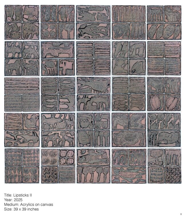 I remember seeing Jalil’s portraits in her last solo at Canvas Gallery, “Between Meaning and Making”, 2023 and I felt they resembled the language of communication design; storyboards and comic book panels. But now that I look at these contour faces I think of simplicity, movement and the techniques used in primitive art, where time was of the essence and survival was at stake, rendering realism in form unnecessary.At this point, looking through Jalil’s paintings and the titles, searching for hints, clues and answers and finding connections and sense feels like you’re playing a game of riddles or fixing a puzzle. The work, then, reminds us of play and curiosity, both of which are lost concepts in the everyday life of an urban city. In finding my own connections, I noticed a work titled “Lipstick II” but there is no Lipstick I. It makes you wonder if the work was made with a lipstick or commemorates a certain lipstick in the artist’s life; maybe the lost lipstick I? The artist leaves nudges and missing links and urges us, the viewers, to absorb, question, feel and connect things together. The artist wants us to speculate and imagine. And lines have been used to do this very task for ages; to connect visible things. We learned as kids to connect lines to dots and that is how we learned the alphabet and developed the sense of a language. The stars were connected to create constellations and they became a map for travelers to navigate the great seas and for others they became faith. Something so grand, a mediator between people and their plans, starts from something very simple; two far off ideas connected with a line, sometimes directly and straight and other times broken or curved or spiraling.