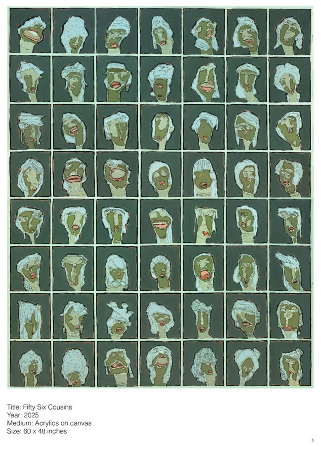 This artist, like Jalil, had an instinctive and gesture-focused practice and she often used aerial layouts and repetition as strategies of mark-making. “Army” and “Fifty Six Cousins” feature a repetitive approach too and the inclusion of portraiture makes these two paintings visually the most distinct, leaning towards representation more than abstraction.